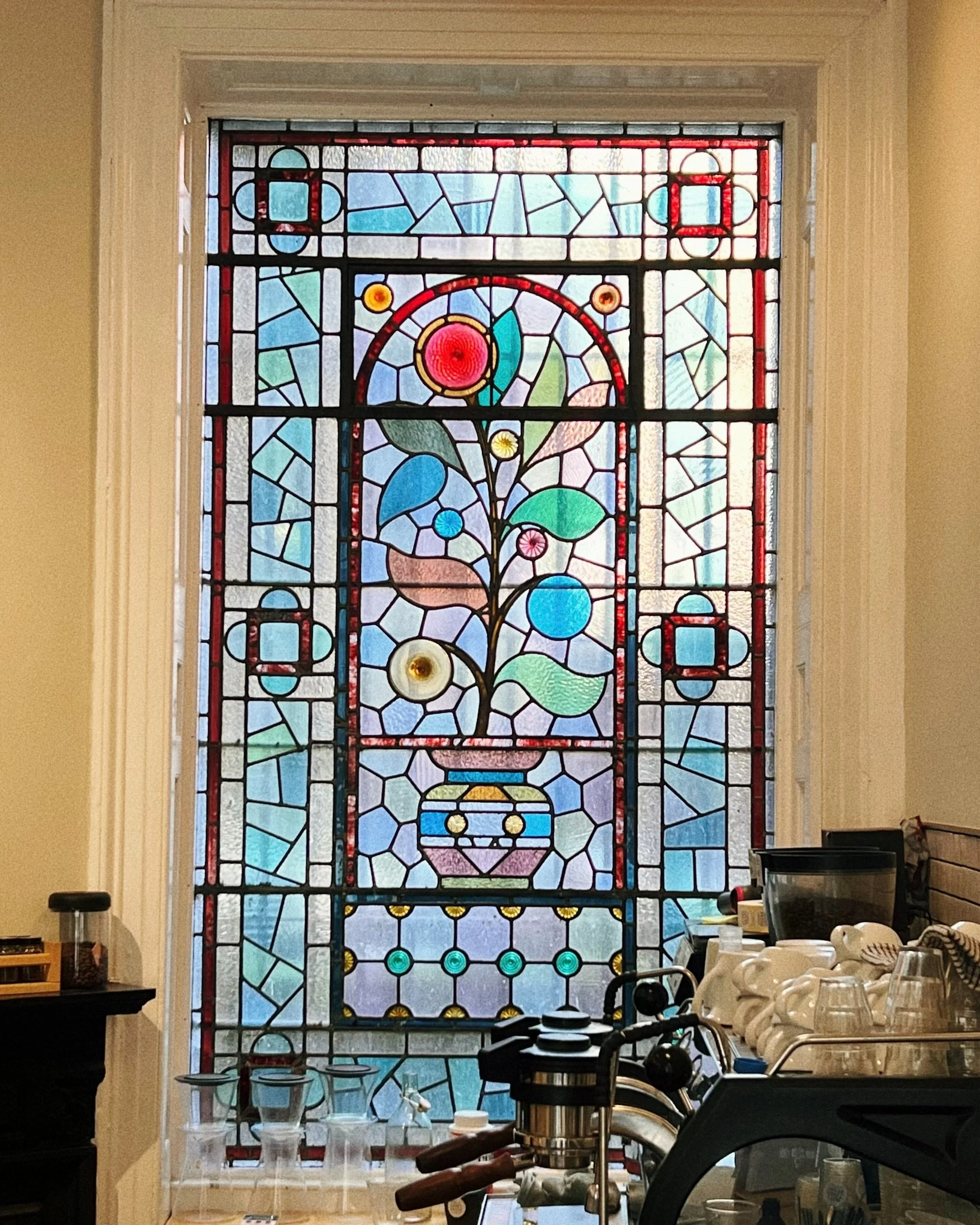 Founded in 2013, there’s an enchanting appeal to this coffee shop, surrounded by soft sandstone buildings and cobblestones. Early morning sun suffused the street with a hazy golden light as we approached the cafes front, cyclists and families milling about on stools and tables outside. Stepping inside, attention is instantly drawn to the tall rectangular stained glass window that sits at the back of the shop. Multifaceted light streams in onto the coffee bar below and stretches out to the rest of the room. Large and square, shelves line the right wall and a long bench sits on the left. A spiralling staircase descending down is tucked away in the corner. A few people are queuing up before us, the baristas chatting away to them as they make their drinks. It gives us ample time to examine the coffee menu that is spread out over a few boards next to the shelves.