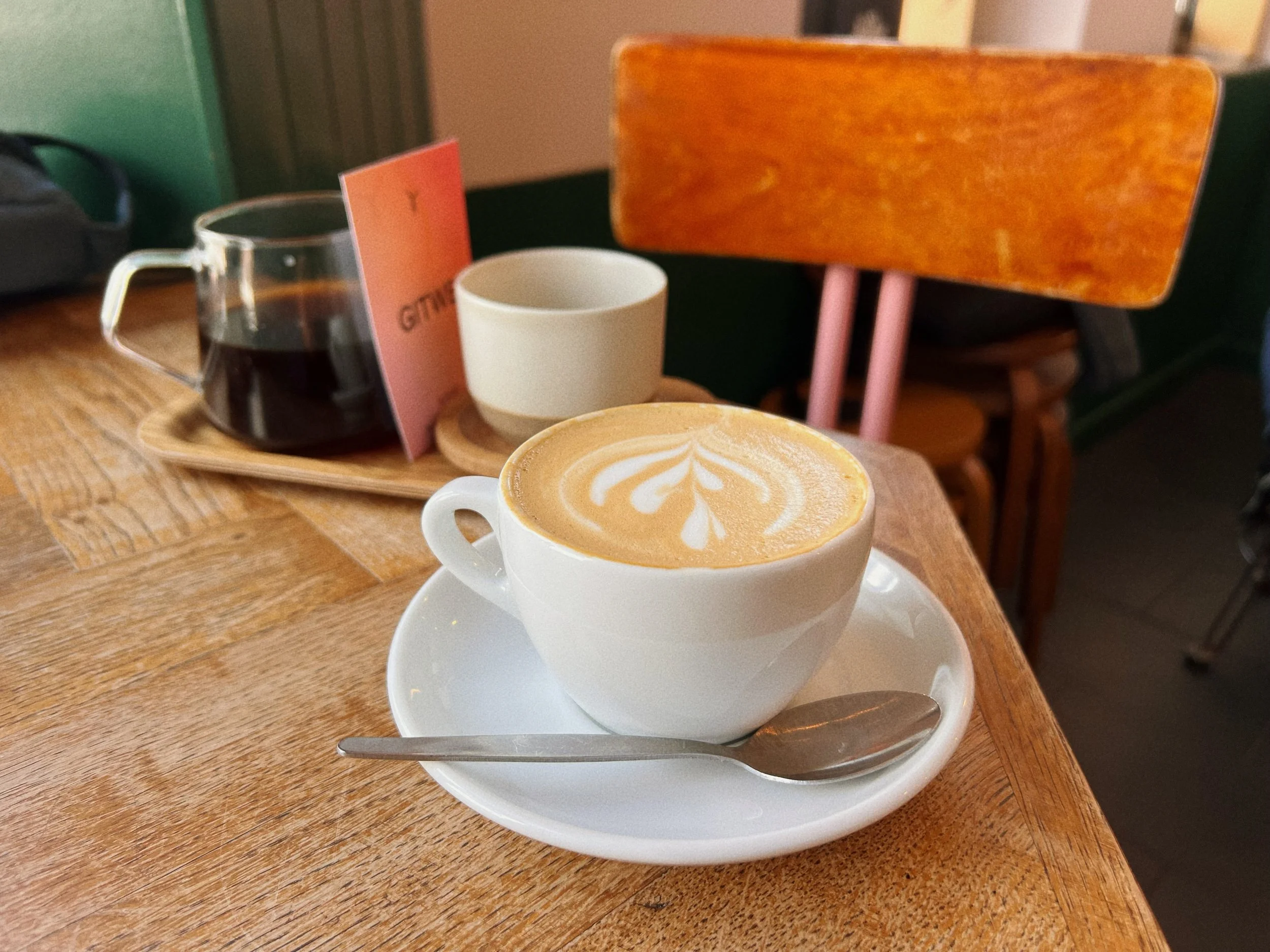 Cartwheel are constantly changing their coffee menu, based on what they’ve been roasting up. The day we visited was hot and in a cycle induced haze we deviated from our usual filter option and went for a Japanese iced brew. Tom has talked about this process in his review on Okende if you’re interested in learning more. We went with an Ethiopian filter, Danche WS which the barista had told us was lovely and fruity. For the flat white we went for the current house espresso, Las Gaviotas, from Columbia.