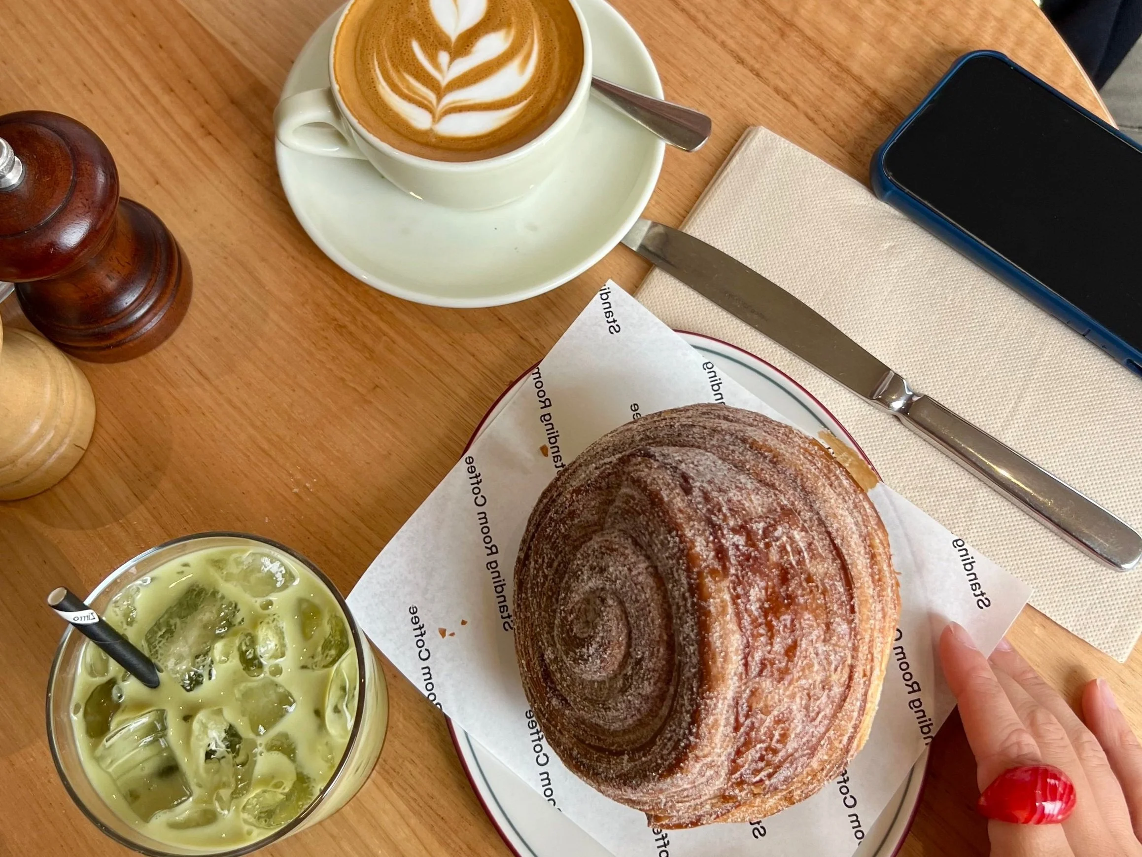 Surrounded by the weekend bustle we headed inside and got a table. The interior is minimalist, with just a few tables set against one wall and a counter in the centre for knocking back espresso shots. Shelves of bagged beans line the walls, as well as some speciality coffee equipment. A glass cabinet greets you as you head to order a coffee. Vows of getting only coffee were soon dismissed as we set eyes on huge flaky morning buns, cinnamon sugar catching and sparkling in the sunlight. Tom went for a flat white while I, feeling rogue, opted for an iced matcha. Standing Rooms coffee is all roasted here in Melbourne and they change up their blends on a seasonal basis. While we were visiting the espresso blend was a mix of Columbian and Brazilian beans with tasting notes of toffee, macadamia and plum. The flat white was flavourful and made for easy drinking, with a lighter roast on the beans. The matcha was strong and not overly sweet. Overall the coffees were good but truthfully it was the pastry that reigned supreme. Buttery golden layers that tore easily apart, crusted and layered with sweet cinnamon sugar and paste. It was divine.